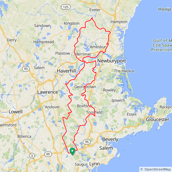 Charles River Wheelmen offers this annual spring century ride from Wakefield, Massachusetts. Participants can choose one of three beautiful routes on slightly rolling rural roads through the Merrimack Valley of northeastern Massachusetts and southern New Hampshire. The 100 mile ride will take you through Exeter and Hampton Falls, NH. The other routes travel through such towns as Boxford, Groveland and Topsfield. All routes pass through the Harold Parker State Forest. View the 2011 ride below