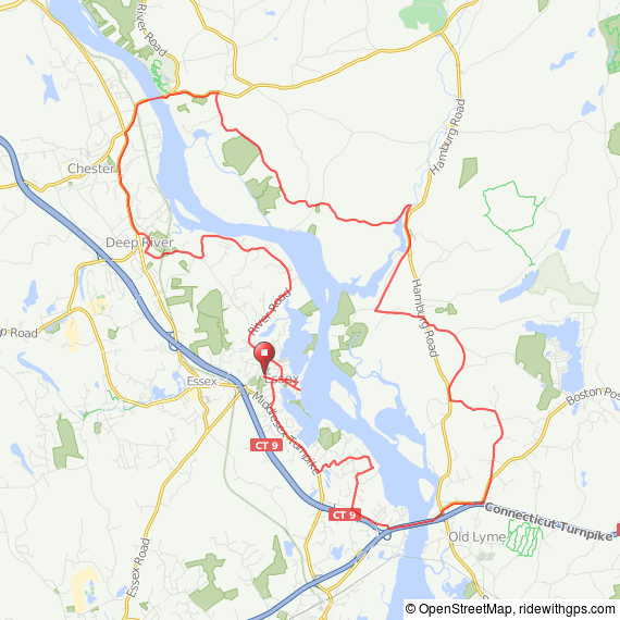 Description from CTBikeRoutes: This interesting and challenging ride passes through the Otter Cove section of Old Saybrook en route to the Baldwin Bridge bike trail crossing the Connecticut River. The route then travels up to Hamburg via mostly back roads before tackling the very hilly and difficult Joshuatown Road route to the Chester Ferry ($1.00 fee). After departing from the ferry the ride heads back to Essex through Deep River via the classic River Road bike route.