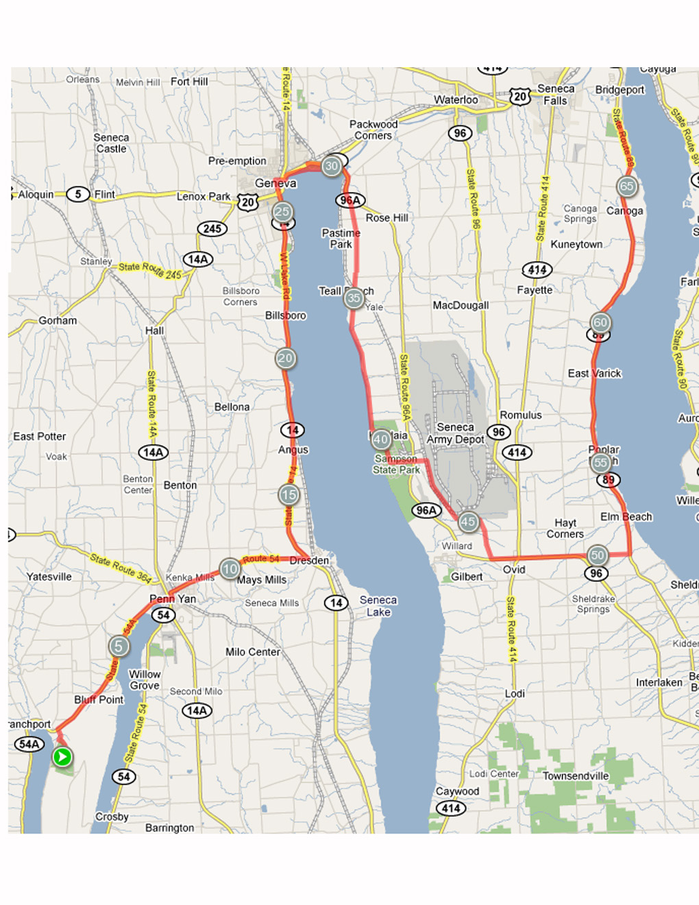 Ride from Keuka Lake State Park 67 miles to our start location, Cayuga Lake State Park. After riding through Seneca, you can ride along East Lake Rd. for several miles before reaching Sampson State. Park. For A shorter but very enjoyable 45 mile route, take Rt. 96A south from Geneva for about 5 miles, then head west on Rt. 111 all the way to Cayuga Lake. Day_5_cue
