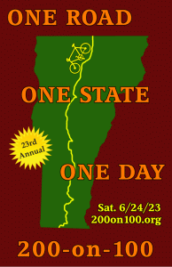 Ride Route 100--200 Miles in One Day. Route 100--200 Miles--One Day Saturday, June 24th, 2023 The 200-on-100 is a one-day bicycle ride that stretches from the Canadian border to the Massachusetts state line. Route 100 is widely recognized as one of Vermont's most scenic highways and the ride is routed to minimize automobile traffic. With nicely… Continue reading Ride 200 on 100, Saturday, June 22, 2024